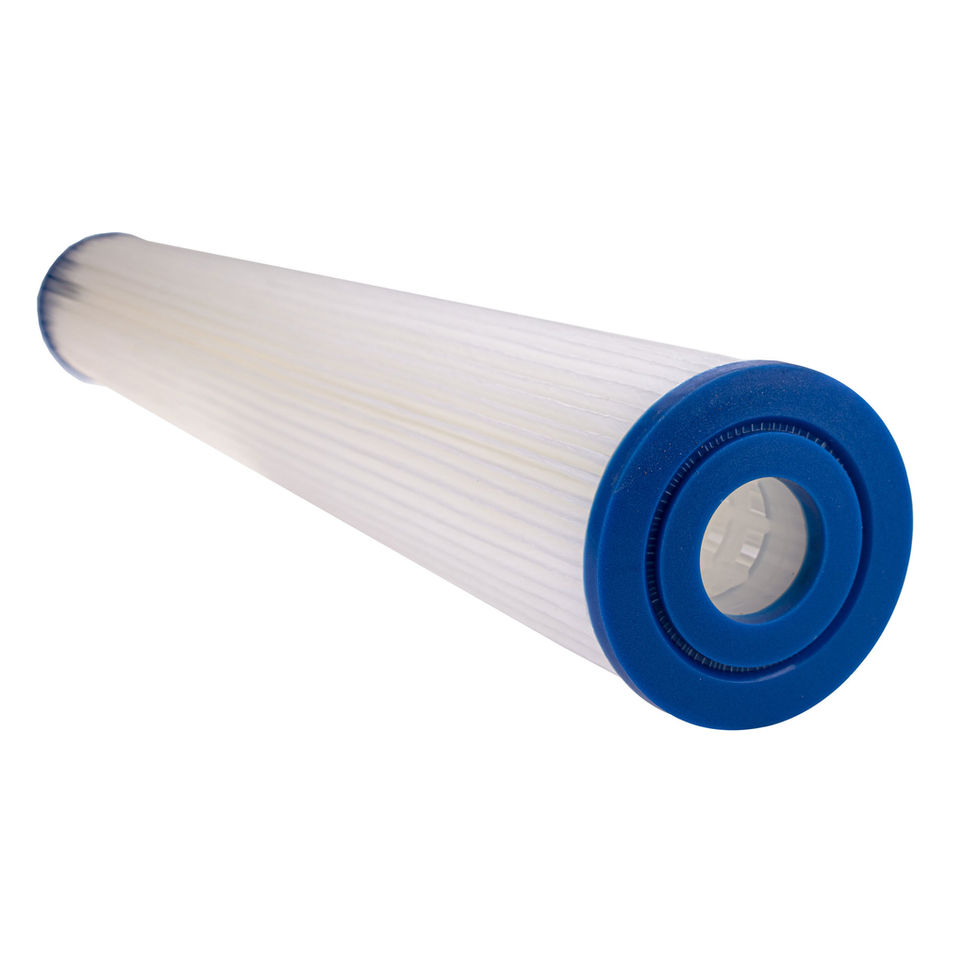 Cartouche de filtration à plis 20" qui retient les particules solides en suspension dont la taille est supérieure ou égale à 5 microns (sable fin, boue, rouille, sédiments, poussières, micro-algues, etc.).