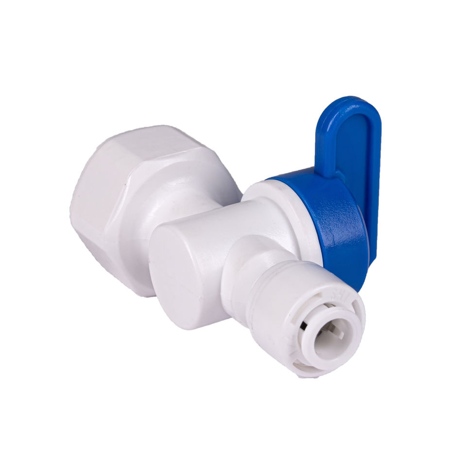 Robinet d'arrêt 1/4 de tour pour tuyau à eau ∅ 1/4'' (6.35 mm). Entrée taraudée 1/2'' DN15 et sortie avec raccord rapide pour tuyau Ø 1/4''.